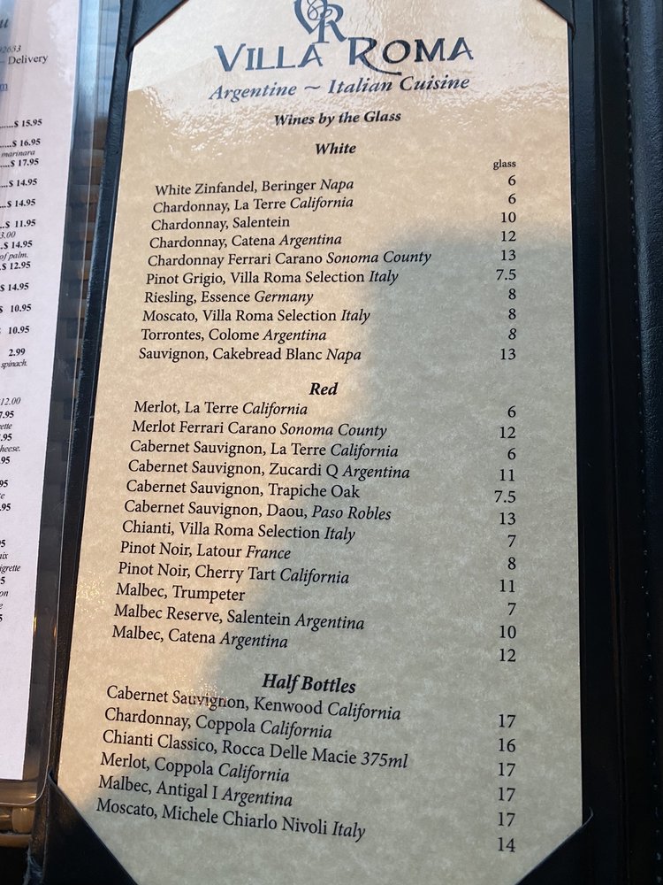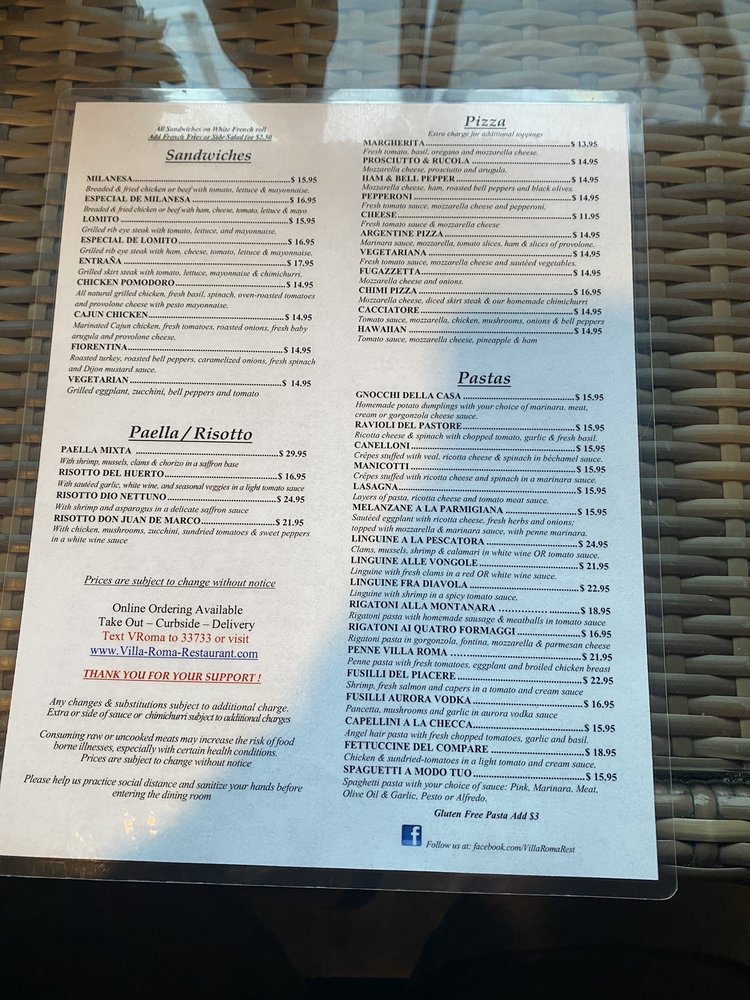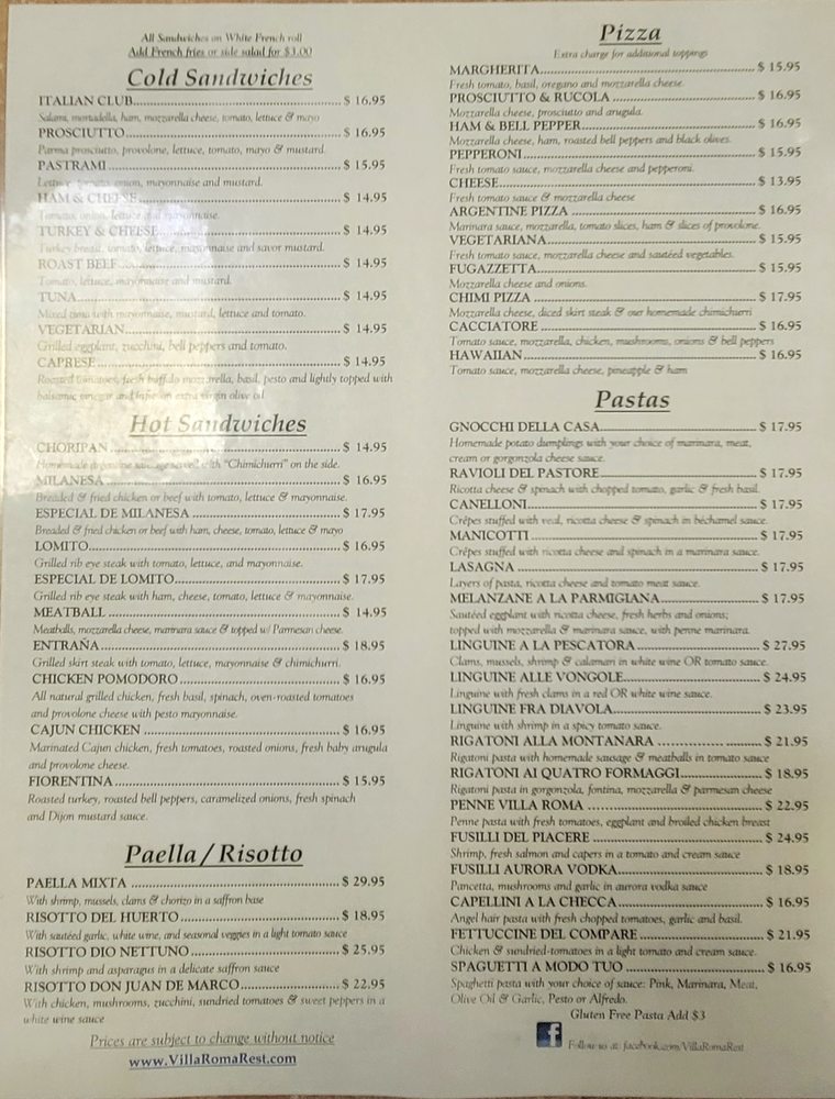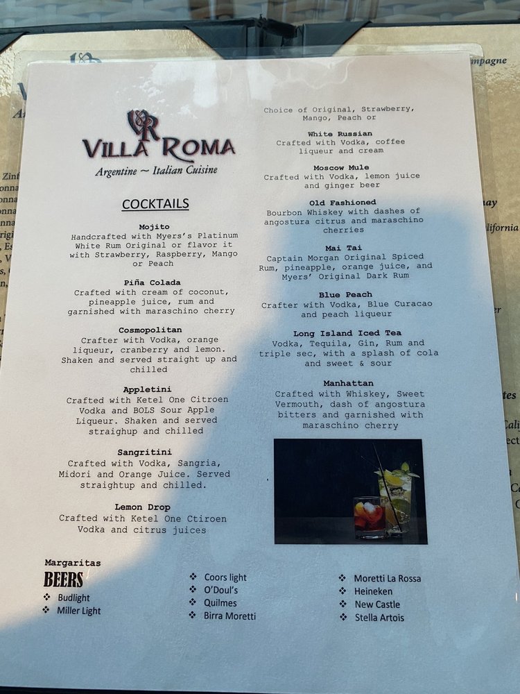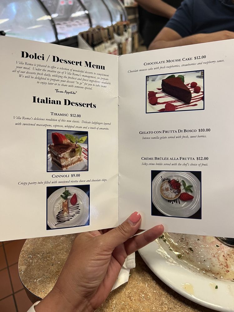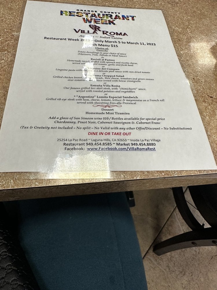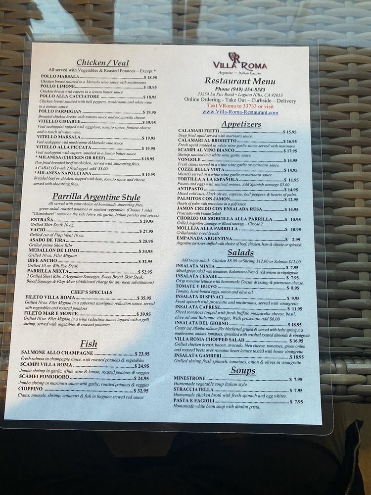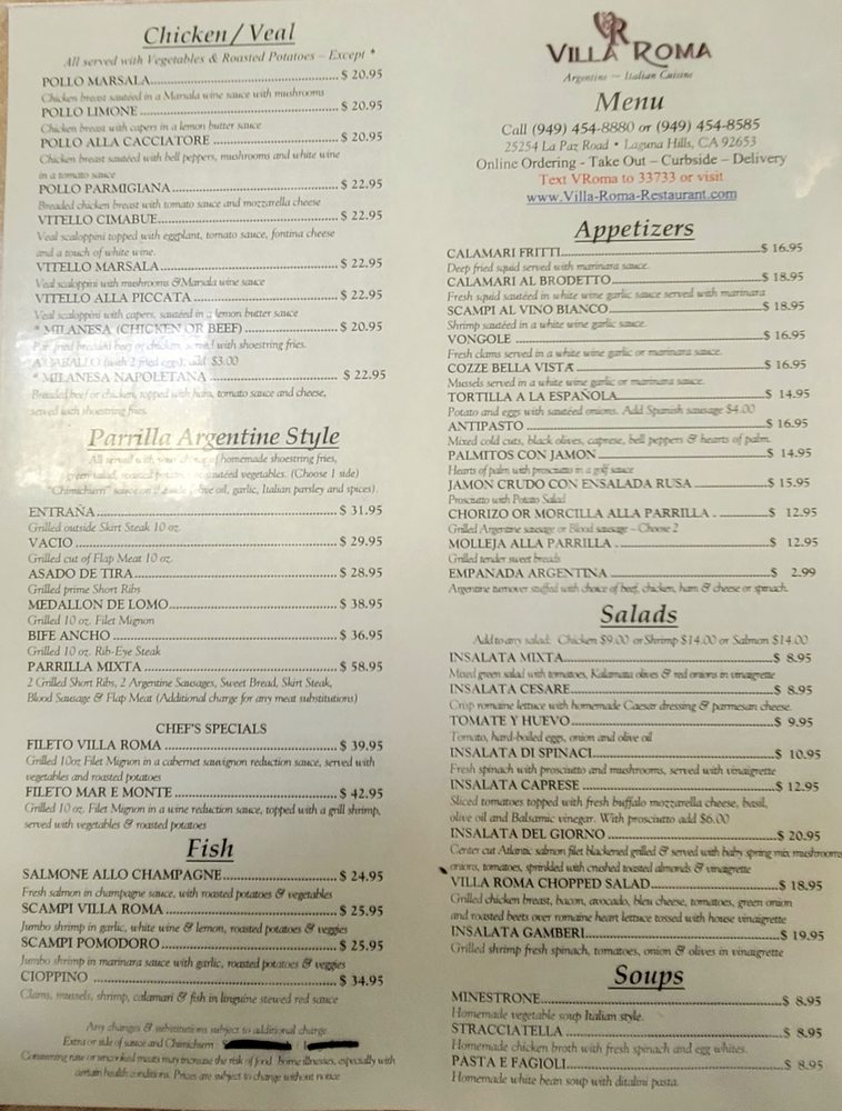 Introducing the menu at Villa Roma, a restaurant in Laguna Hills, CA, offering a wide array of delicious dishes. From Antipasto Prosciutto to Minestrone Soup and Ensalada Mixta, their menu features a variety of appetizers, soups, and salads. The Villa Roma Chopped Salad stands out with grilled chicken, bacon, avocado, and bleu cheese. Customers rave about the fantastic service and the must-try Tiramisu. With options like vegan and vegetarian dishes, full bar service, and outdoor seating, Villa Roma caters to a diverse range of tastes and preferences. Don't miss out on the cozy ambience, attentive staff, and live music for a memorable dining experience at Villa Roma.